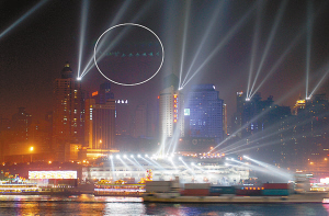 昨日中午,記者從小王提供的拍攝于前晚7點17分的照片上看到,朝天門的“朝天揚帆”燈飾已經打開,顏色不一的激光燈從周圍的建筑物頂上射出耀眼的彩光。而在朝天門大酒店的左上方,就能清晰地看到一串“飛碟”正斜斜地“飛”過。