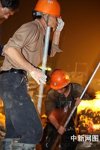 熟悉現場情況的工人正在尋找可能存活的工友。作者:張兆嶺