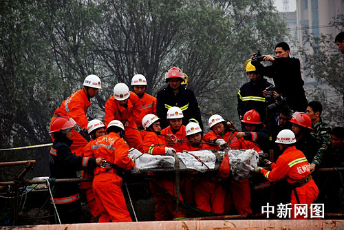 圖為消防救援人員從坍塌的坑內救出一人。作 者:李玉飛