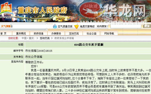 在605公交車(chē)上遭偷,求助司機(jī)又受冷遇,只好眼睜睜看著賊娃子脫身,重慶市民熊先生就遭遇了這樣無(wú)奈又憤怒的事情。氣憤之余,熊先生提筆向市長(zhǎng)求助。今日,記者在重慶市政府信息網(wǎng)市長(zhǎng)信箱上看到,該信箱公布了熊先生的訴求,有關(guān)部門(mén)也已著手解決了熊先生反映的尷尬之事。