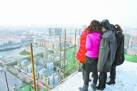 昨日下午3時(shí),記者趕到航海路與未來路交叉口附近的中鼎翡翠2期公園壹號(hào)樓盤。記者上到25層樓頂,看到6名女子正站在西側(cè)沒有任何防護(hù)設(shè)施的邊緣。聞?dòng)嵹s到的管城消防大隊(duì)一中隊(duì)消防員和航海路派出所民警已經(jīng)趕到現(xiàn)場,對(duì)欲跳樓的6名女子進(jìn)行勸說。由于風(fēng)大很冷,記者注意到這些售樓小姐相互之間聚得很緊。