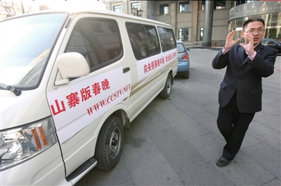 向央視春晚叫板,給全國人民拜年。”昨天,朝陽區華嚴北里8號院2號樓下,一輛寫有挑釁口號的面包車惹得市民駐足觀看。這輛“牛車”的車主老孟說,要自辦一場草根參加的山寨版春晚,時間與央視春晚同步,通過網絡直播。目的就是向央視春晚叫板。