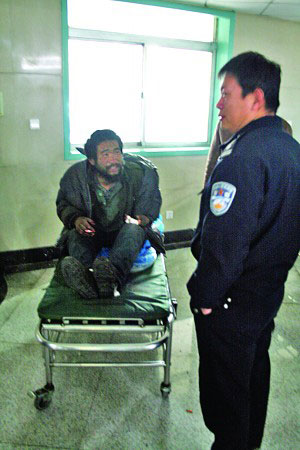 下午4點,濟南市中心醫院急診大廳,一名滿臉胡子、衣著破舊的男子坐在擔架上。“我是來看病的,放開我”,雙腳還被繃帶束縛著的他搖頭晃腦,“我喝酒了,我做錯了,我給你們磕頭”。