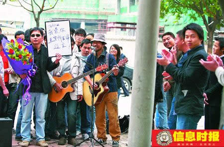 一名男子手持玫瑰花、高舉求愛宣言,并邀來樂隊助陣高唱情歌。昨日上午,珠江新城華利路附近某小區門口的新奇場面引來眾人圍觀。求愛男子自稱是在網上看到女主角所在單位為其做的征婚廣告,專程從哈爾濱趕來,并想出這個主意以期望感動對方。圍觀者紛紛質疑這場“求愛秀”是商業單位的宣傳炒作。