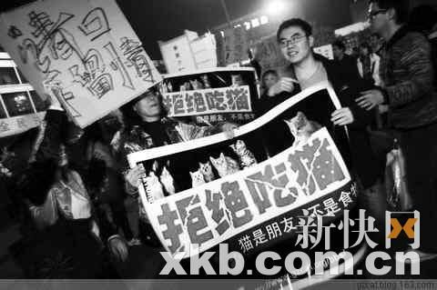 在廣場上,一見“聞貓即興”等人出來了,其他人都著急地圍上去詢問。盡管結果不是太讓人滿意,但大伙還是決定在廣場上舉行一次小型的抗議活動。100多人圍在一起,高舉著“請發揚人道主義,放過它們”、“請口下留情”、“拒吃貓肉”等紙牌,喊著口號。并有細心的網友拿著印制好的傳單,向候車的乘客宣傳“不吃貓肉”。對此,路人大都報以一笑。