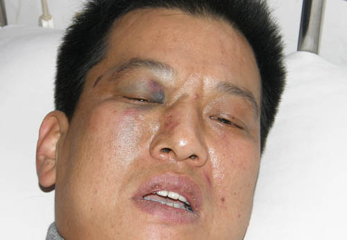 據(jù)他回憶說,12月15日下午,我在杜康花園小區(qū)尚要武家等車去灌液化氣,大約4點(diǎn)鐘左右,一伙不明身份的人(后獲悉是該縣刑警)闖進(jìn)家中,一人摟著我脖子用手槍指著我頭不讓動(dòng),將我摔在地上,另一人將我皮帶抽掉,又把鞋子脫掉,對我搜身,將電話拿走,我說我沒辦違法事,控制我的人用手槍在我頭上砸了兩下說:“不準(zhǔn)說話,不許動(dòng)。”此人用膝蓋頂著我脖子,我呼吸困難,我說我出不來氣,掙扎了一下,此人用槍在我頭上砸了一下,又有一人在我胸口跺了兩腳,走到我左側(cè)朝我面部、頭上猛跺,隨后將我背銬手銬塞上車(非警車)。