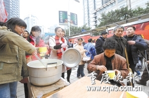 張世文說,他們一共準備了50公斤大米、15公斤蘿卜、10公斤豬肉和部分白菜,但沒有想到直到昨日中午12時左右,來喝粥的也不過10多人,整整一大鍋的稀粥還剩下一大半。擔心部分流浪者抹不下面子,志愿者們決定主動上門送粥。在臨江門地下通道重百超市臨江門店旁的出口梯坎上,長期住有10多個流浪者。但面對志愿者們送上門來的一大鍋稀飯,流浪者們居然一哄而散,很快跑得無影無蹤,留下一地雜亂的棉絮衣服。