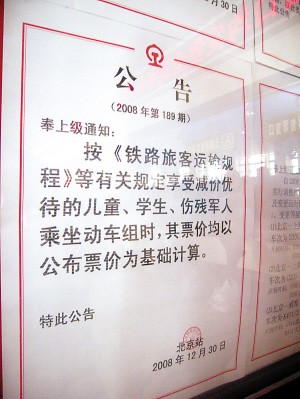 昨天下午,記者來到北京站售票大廳,在大廳的公告欄上看到,一張編號為“2008年第189期”的公告上稱,奉上級通知,按《鐵路旅客運輸規(guī)程》等有關規(guī)定享受減價優(yōu)待的兒童、學生、傷殘軍人乘坐動車組時,其票價均以公布票價為基礎計算。