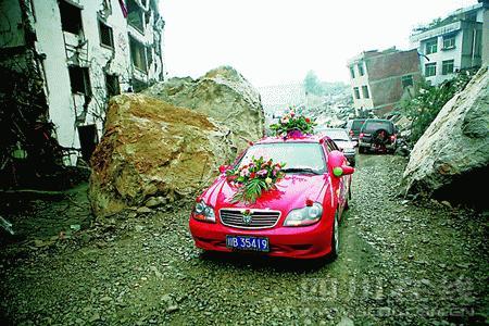 眼見一對貼著大紅喜字的結婚車隊擦肩而過,敏銳的遲阿娟跳下車拿著鏡頭緊追,“我以最快速度緊追行駛的迎親車隊,差點跑斷腸子……”未能打聽到進一步信息,遲阿娟很遺憾:“他們說新人不能下轎,車子不能停留,新人不愿說出名字,更不愿留下電話,只是說:我們是北川人,地震雖然奪走了親人、財產,但是,生活還是要繼續!”