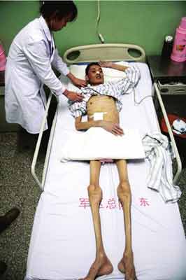 昨天下午,記者在軍區(qū)總院普外科病房見到了耿松峰,他雙臂向上彎曲放在枕邊,右側(cè)肩部正進(jìn)行靜脈營養(yǎng)注射,一袋普通塑料袋大小的乳白色液體已經(jīng)見底。他說話吃力,但仍然翕動著嘴唇說:“伯伯(指普外科主任)是個好人。”身高1.72米、體重曾60公斤的他現(xiàn)在只有33公斤,大腿也只有成年男性手腕粗。他母親用極不流利的普通話說,因為兒子的病,已經(jīng)家徒四壁,親戚、高利貸,各種借錢的方法都想到了,已經(jīng)花了20多萬,可還是不夠,兒媳也因此要離婚。“現(xiàn)在已經(jīng)欠醫(yī)院5萬塊錢了,可我也不能看著兒子死啊”。