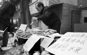 小販在攤前寫(xiě)詩(shī)詞廣告推銷(xiāo)水果(圖)