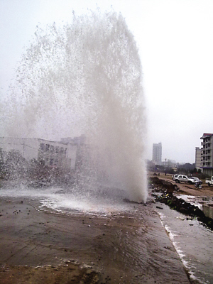 “先是聽到吱吱吱地響,馬上要到10點時,突然‘砰’的一聲后,一股水柱就沖上天了。”60多歲的黃婆婆當時在現場,據她介紹,沖天水柱有人的大腿粗細,“起碼有十多米高。”