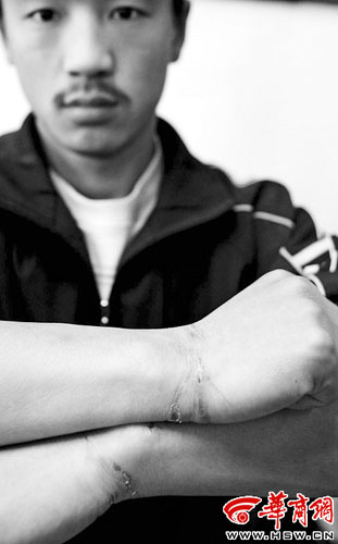 吳明的兩個手腕上有明顯的傷痕。他曾經(jīng)去醫(yī)院檢查過,診斷為肌肉拉傷。他開了些療傷的藥,花費(fèi)110元。