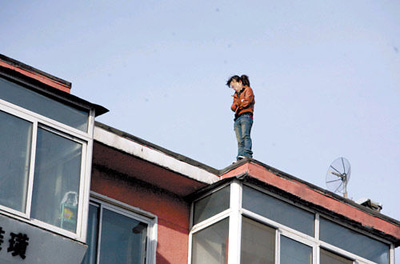 昨天(16日)13時許,一名年輕女子爬上長春市同志街與清華路交會處一棟樓頂,欲輕生。消防戰士和派出所民警一直勸說,她始終不肯下樓。