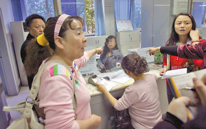 昨日上午9點(diǎn)半,醫(yī)療保險管理中心渝中區(qū)分中心二樓接待大廳內(nèi)人頭攢動,在一號窗口前排隊等待辦理業(yè)務(wù)的市民多達(dá)14人,但隊伍卻不曾向前移動半步。因?yàn)橐惶柎翱趦?nèi)根本不見工作人員的身影,這些市民從上午9點(diǎn)開始已經(jīng)守著空窗排了半小時。