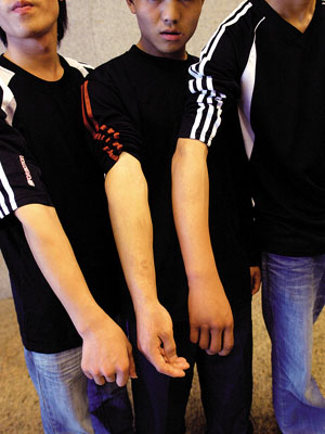 前天,小羌他們三人拉起衣袖,向記者展示了右手前臂(見左圖)。從表面上看,手臂上沒有傷口,但就感覺比他們的左手要腫,而且有些不協調的彎曲。小鵬和小田說,他們的手臂至今還在疼痛。