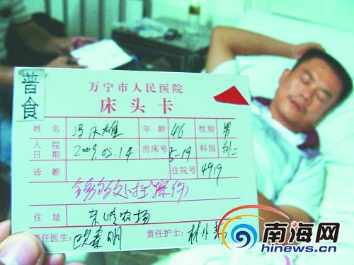 5月20日下午,記者在萬寧市人民醫院住院部見到了被打的收膠工馮慶雄,他正躺在病床上,表情看起來痛苦,不時用手撐在后腰撫摸腰間。據他的主治醫生介紹,經診斷馮的傷情為:頭、胸、腰等身體多個部位軟組織挫傷,經B超檢查發現,其右腎下極挫傷。