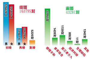 新人笑,離人哭,每個婚姻登記處每一天都在上演不同的悲歡離合。2009年已經(jīng)過了一半,半年來,有163795對新人走進婚姻殿堂,又有43281對夫妻分道揚鑣。昨日,本報邀婚姻專家剖析這半年的婚姻現(xiàn)象,并為不同年齡不同婚齡讀者支招。