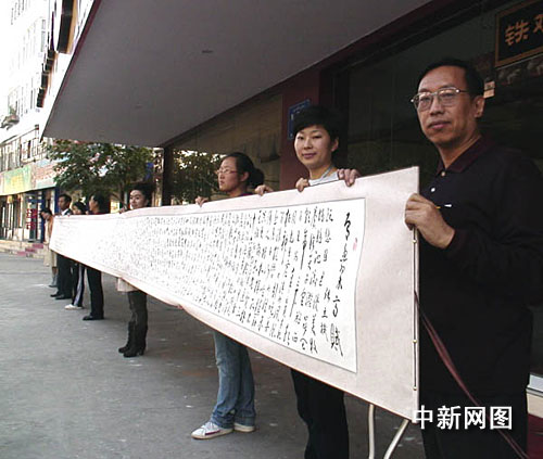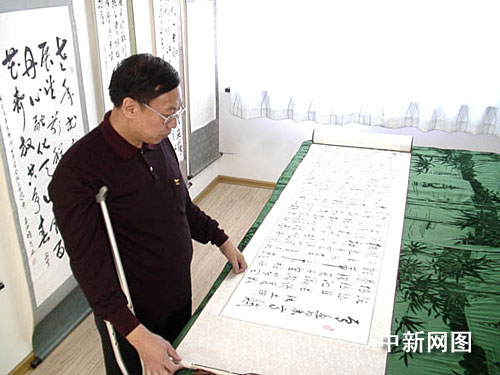 中新網(wǎng)烏魯木齊9月24日電(王小軍)新疆烏魯木齊一殘疾人身殘志堅,閑暇之余,拿起手中的畫筆,書寫下一幅13米長卷,獻(xiàn)給新中國成立六十周年。