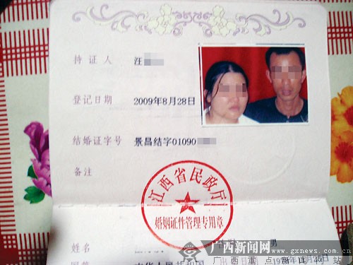 隨后,兩人帶來了一個年輕女子。從女子出具的身份證和戶口本上得知,她叫張×蘭,廣西賓陽人,今年28歲。見該女子模樣不錯,汪家心生喜歡。8月28日,汪先生支付了幾千元介紹費給中間人后,和張×蘭到當地婚姻登記機關進行了登記。