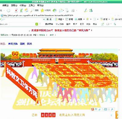 網(wǎng)友“l(fā)eining”加入方陣后說,“國慶,出個(gè)網(wǎng)民方陣也不錯(cuò),喜歡熱鬧的網(wǎng)友可以踴躍參加”。“l(fā)ein-ing”還提議,以后可以多在網(wǎng)上做慶典,網(wǎng)慶的最大好處是簡約、文明、時(shí)尚。有網(wǎng)友就說:“我想?yún)⑴c其中,唱著歌,踏著正步,注視著天安門,熱淚盈眶,祖國萬歲!”