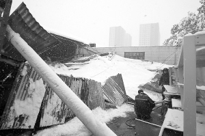 昨日15時許,裕華路與西二環交叉口一個建筑工地,漫天大雪讓工人們無法開工。忽然只聽“嘩啦”一聲巨響,工人張先生看到,他們的廚房——一座四五十平方米的活動板房從根部倒塌,鍋、灶、蔬菜等都被壓在了下面!爱敃r里面沒有人,所以沒人受傷!睆垘煾嫡f,這個廚房負責100多人的伙食,這下子晚飯沒了著落。