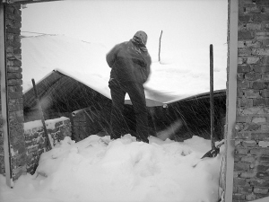 這個養殖場位于宋營村村南,是村民郎鳳聯家的。昨天17時許,記者在現場看到,養殖場約600平方米,四周是磚砌的圍墻,頂部是用鋼筋支撐的彩鋼板架設的。整個養殖場的頂部都已坍塌,彩鋼板上已經積了一尺多厚的雪。在養殖場的圍墻外,可以聽到豬的叫聲。郎鳳聯的家人爬到坍塌的彩鋼板上,正在想辦法搶救被壓的牲畜。因為雪很沉,他們搶救了一個多小時,才救出一只羊。