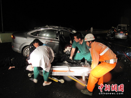 當天晚上21時20分,北海市消防官兵接警到達位于北鐵收費站往鐵山港方向500米處的事故現場后,見一輛車牌號為滬J86981的福特轎車橫擺在公路中間,車頭破碎不堪,車體頂部面目全非。在距離該車10米左右,一輛車牌號為桂E36186的力帆轎車亦直擺在公路邊上,車頭和車體也存在不同程度的破損。同時公路上還灑滿了零零星星的玻璃碎片和車體殘片,地上躺著被甩出車外二男一女已當場死亡。而兩車的駕駛員分別被困在駕駛室,動彈不得。