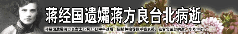 蔣經國遺孀蔣方良2004年12月15日中午12時許在臺北榮總病逝,對于這位來自異國的蔣家媳婦,島內媒體形容為“沒有聲音”的人,從西伯利亞到中國大陸,再從溪口到臺島,蔣方良從不踏入政治,她的世界就是家庭。