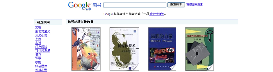 “人類已經撰寫的絕大多數圖書會隨著歲月流逝消失了、不見了。圖書是世界共有知識、文化遺產的重要組成部分,書籍數字化將使成百上千萬絕版但受版權保護的書籍‘復生’”,這是谷歌的聯合創始人和技術總裁謝爾蓋·布林(Sergey Brin)發表的谷歌數字圖書館建立的初衷。 負責圖書事宜的谷歌全球研發總監Daniel Clancy,近日對中國部分新聞媒體表示,谷歌愿意和所有的作家一起協商解決版權問題。此外谷歌強調,圖書搜索只是為搜索,不是為閱讀,希望通過溝通使中文著作能在世界范圍得到共享。[詳細] |
