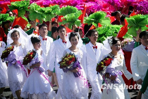 圖:30對新婚夫婦亮相群眾游行隊伍