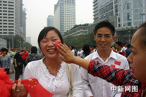 圖:新疆維吾爾族姐妹臉貼國旗裝