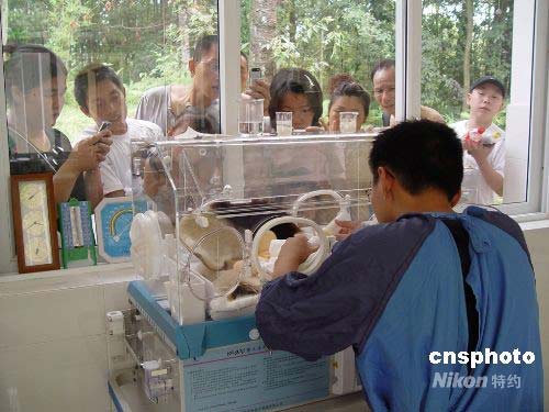 游客觀看震后出生的首對大熊貓雙胞胎寶寶