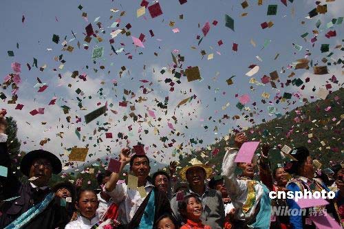 圖:藏族群眾拋灑龍達感謝支援者