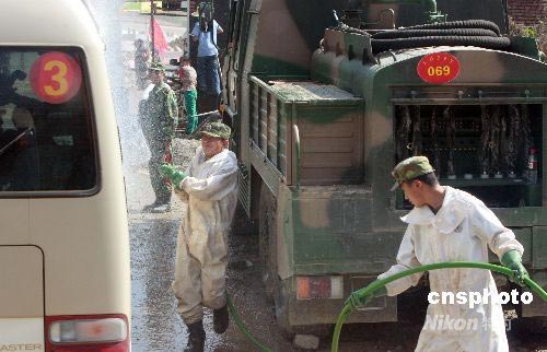 圖:北川災區為進出車輛實行嚴格消毒