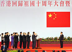慶祝香港回歸祖國十周年大會暨香港特區第三屆政府宣誓就職典禮七月一日在香港會展中心舉行。中共中央總書記、國家主席、中央軍委主席胡錦濤出席并作重要講話。[全文]