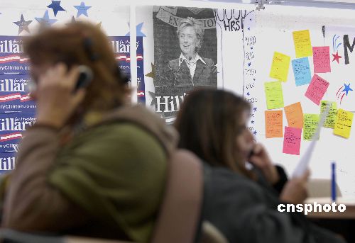 二零零七年的最后一個(gè)周末,美國,設(shè)于舊廠房中的希拉里舊金山競選總部的義工們加班加點(diǎn),給愛荷華州的選民打電話,號(hào)召民主黨的選民們?yōu)橄@锿镀。中新社發(fā) 陳鋼 攝
