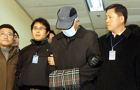 2月12日,在韓國首都首爾,警察將崇禮門縱火案嫌疑人蔡姓男子押送至警察局。