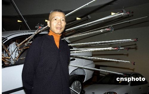 圖為館內蔡國強的裝置藝術作品《不合時宜:舞臺一》,其模擬汽車爆炸軌跡。