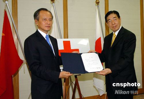 6月20日,中國駐日大使崔天凱前往位于東京的日本紅十字會代表中國政府向日本巖手宮城地震災區(qū)提供10萬美金的救災捐款,并再次對地震災區(qū)人民表示慰問。圖為崔天凱與日本紅十字會會長近衛(wèi)忠煇。中新社發(fā) 朱沿華 攝