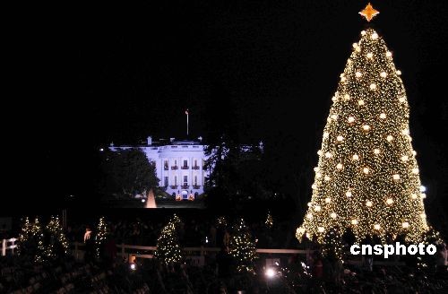 當(dāng)?shù)貢r(shí)間12月4日晚,美國華盛頓白宮南草坪萬人聚集,美國總統(tǒng)布什和夫人勞拉出席2008年“國家圣誕樹”點(diǎn)亮儀式。白宮南草坪的“國家圣誕樹”點(diǎn)亮儀式最早開始于1923年,白宮的主人都會(huì)在每年十二月第一周點(diǎn)亮這棵大型的圣誕樹和周圍栽種著象征美國五十個(gè)州小樹上的燈珠。圖為當(dāng)夜白宮在圣誕樹的映照下。中新社發(fā) 邱江波 攝