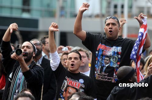 當地時間一月二十日清晨,兩千多名洛杉磯市民聚集在洛杉磯動感廣場(LA LIVE),通過大屏幕觀看美國第四十四任總統奧巴馬就職儀式。當電視畫面出現卸任總統布什時,人群中發出噓聲,一些奧巴馬支持者向布什表達不滿。
