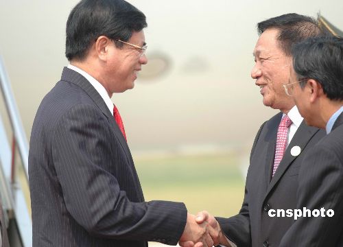 十月二十六日中午,老撾總理波松(左)飛抵廣西南寧市,出席將于十月二十八日開幕的第四屆中國—東盟博覽會。圖為波松在南寧國際機場受到廣西官員的歡迎。中新社發 蔣雪林 攝