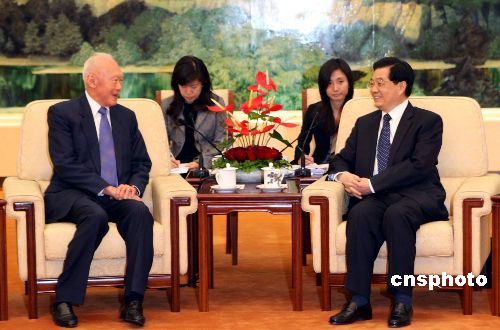 十一月十六日,中國(guó)國(guó)家主席胡錦濤在北京人民大會(huì)堂會(huì)見(jiàn)來(lái)訪(fǎng)的新加坡內(nèi)閣資政李光耀。中新社發(fā) 任海霞 攝
