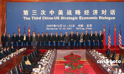 十二月十二日,第三次中美戰略經濟對話在北京中信國安第一城開幕。會議開始前,中國國務院副總理吳儀(前右八)、美國財長鮑爾森(前右七)與中美參會部長高官們合影。中新社發 毛建軍 攝