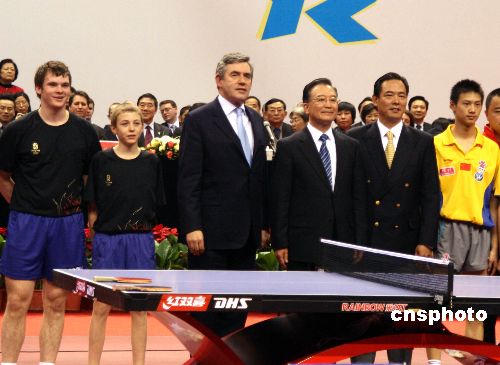 十八日下午,中國總理溫家寶與來華訪問的英國首相布朗,在中國人民大學“世紀館”觀看中英乒乓球友誼賽,并與運動員進行了交流。中新社發 周兆軍 攝
