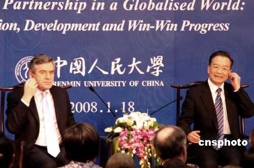 十八日下午,中國(guó)總理溫家寶與來(lái)華訪問的英國(guó)首相布朗一起來(lái)到中國(guó)人民大學(xué),與中英兩國(guó)的公眾代表進(jìn)行交流,共同回答兩國(guó)公眾關(guān)心的問題。中新社發(fā) 周兆軍 攝