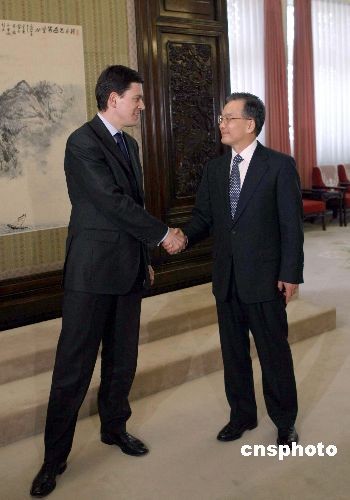 2月28日,中國國務院總理溫家寶在北京中南海紫光閣會見來訪的英國外交大臣米利班德。中新社發 盛佳鵬 攝
