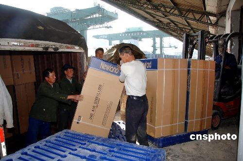 五月二十一日,福州市民政局工作人員在福州鐵路貨運東站裝運發(fā)送災(zāi)區(qū)急需的紫外線空氣清新機。經(jīng)過跟蹤汶川地震救災(zāi)工作需求,福州向社會各界發(fā)布捐助信息,至二十日十六時收到各界人士捐獻的紫外線空氣清新機、小型輪式消毒車、接骨板、嬰兒奶粉、衣被等急需物品價值約一千三百萬元人民幣。