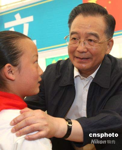5月23日上午9時許,國務院總理溫家寶來到四川綿陽,在九洲帳篷學?赐卣馂膮^學生。中新社發 趙振清 攝